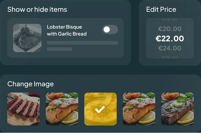 Update your digital restaurant menu instantly from the OZZO Merchant mobile app. Change prices, items, availability, and specials in real time so your QR code menu always reflects the latest information for guests.